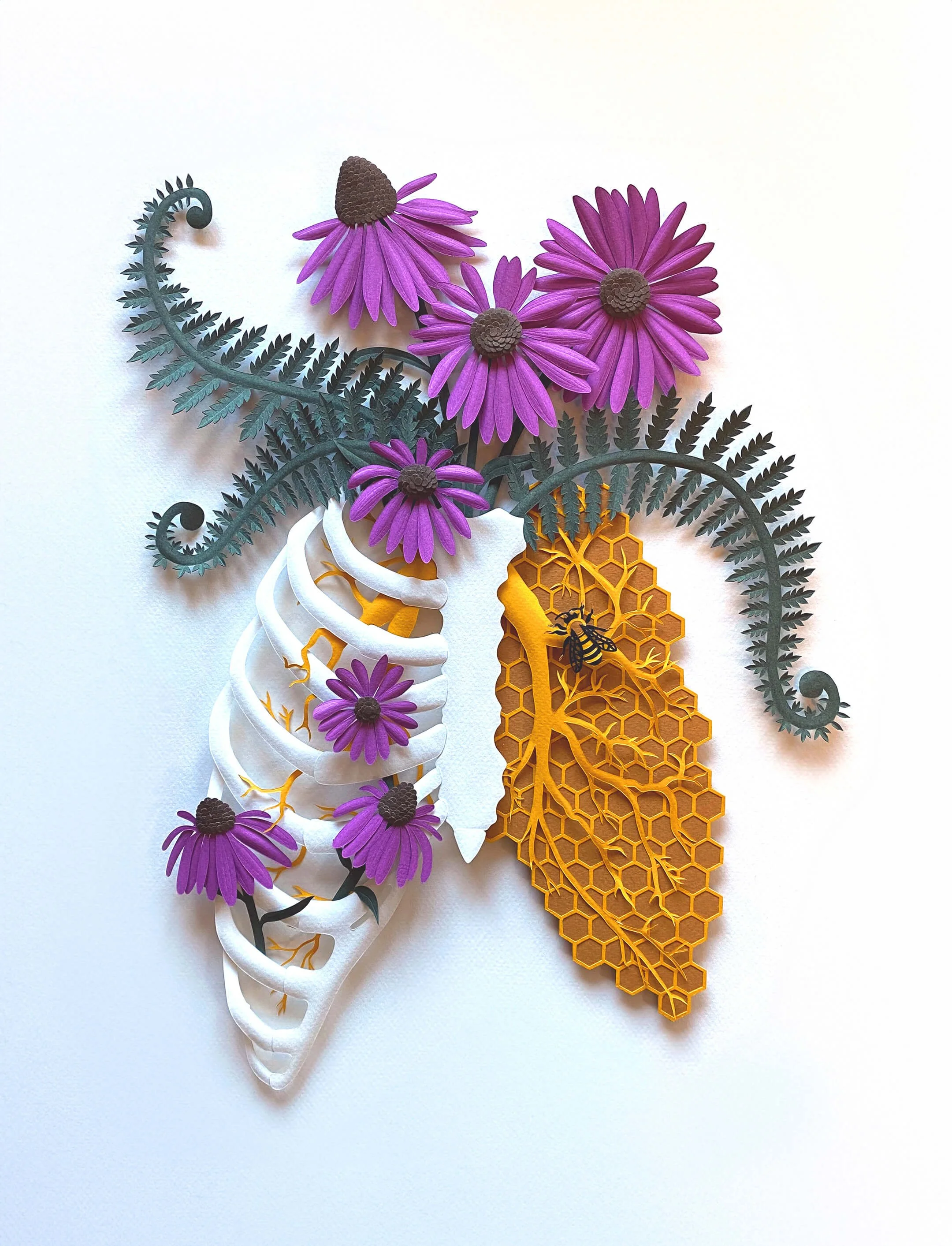 Budzisz earned a B.F.A. in Communication Arts & Design from Virginia Commonwealth University in 2000. She learned about the art of paper sculpture during her studies and fell in love with the medium of paper. She creates her paper sculptures by cutting intricate shapes from archival paper with a utility knife. She curves the individual cut shapes with a dowel, then glues the pieces together between layers of foam core to create dimensional works of art.